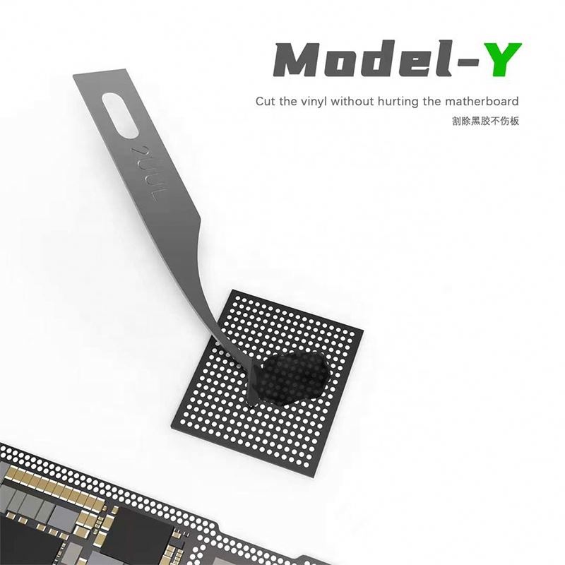 Model Y: Skær den sorte lim fra underfyldningen uden at beskadige bundkortet