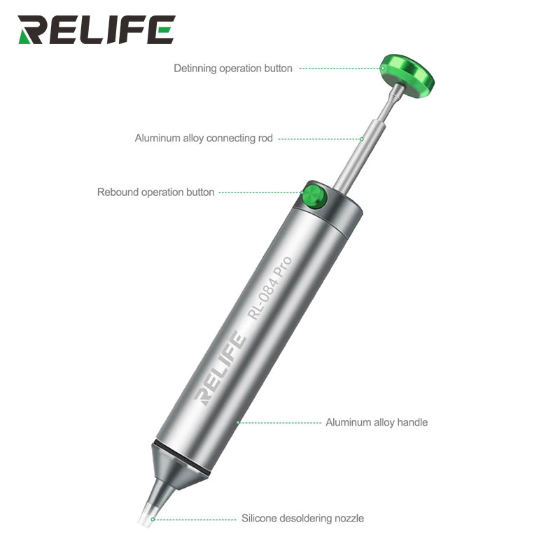 Stærk sugeevne: Udstyret med et robust vakuumsystem og et meget tætnet design sikrer RELIFE RL-084 Pro effektiv fjernelse af loddetin fra selv indviklede elektroniske komponenter uden at forårsage skade.